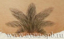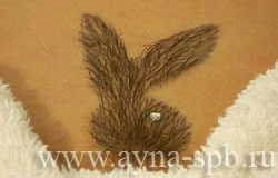 2. Удаляем лишние волосы фитосмолой для ручной работы. С помощью небольших комочков смолы очерчиваем основные контуры рисунка. Именно аппликационная техника, т.е. возможность оставлять комочек фитосмолы на теле для лучшего схватывания, делает фитосмолу незаменимым для интимных стрижек средством. |