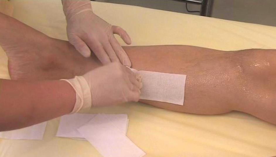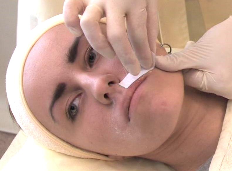 Наносят состав по росту волос, прижимают к поверхности тканевую полоску. Снимают, придерживая за ткань, против роста волос, резким движением, параллельно коже.