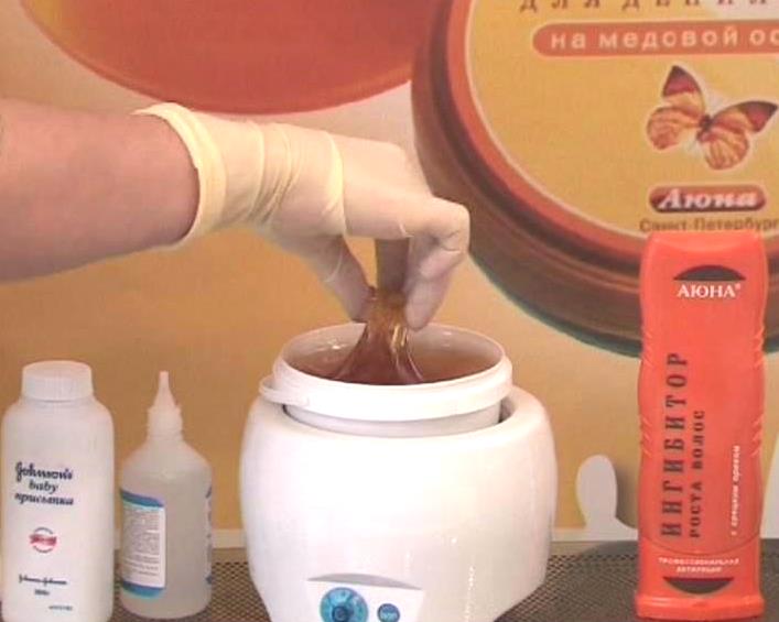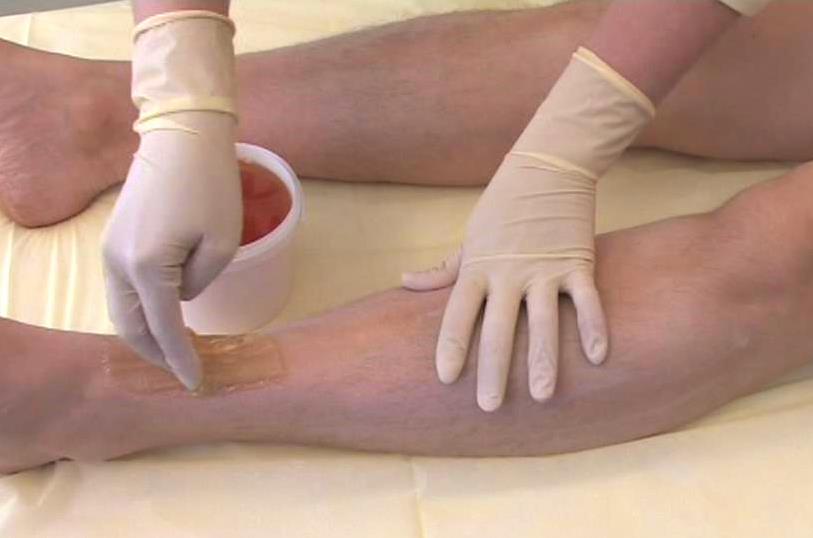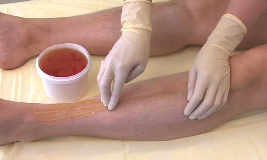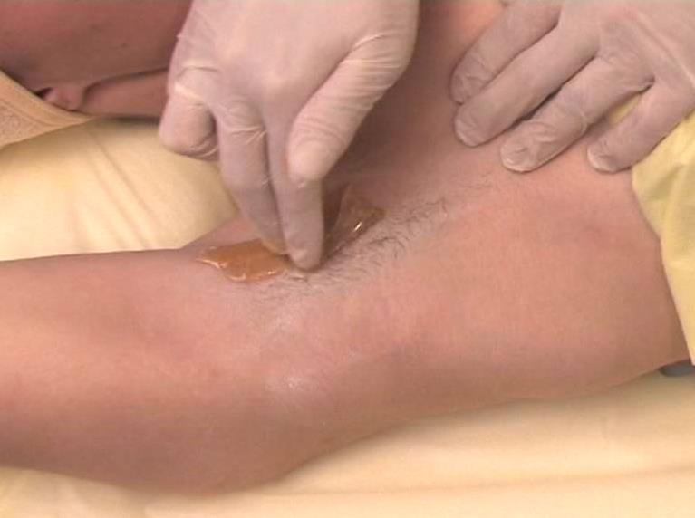 На тело перед процедурой наносят тонкий слой талька для впитывания излишней влаги. Комочек пасты наносят против роста волос.