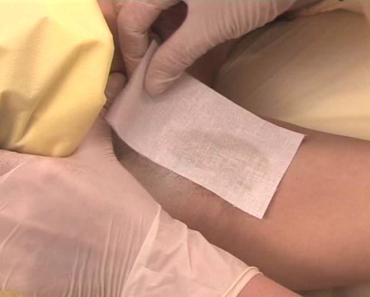 - Обработайте кожу перед процедурой. Излишнюю влагу промокните салфеткой, нанесите на место предполагаемой депиляции тонкий слой талька (можно детской присыпки).