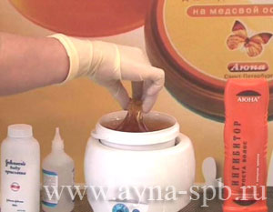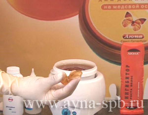 При выполнении бандажной техники сахарную пасту или медовую фитосмолу разогревают в нагревателе для воска или микроволновой печке до температуры 37-45 градусов. Наносить состав можно двумя способами: с помощью шпателя или с помощью ролика (если сахарная паста или фитосмола – в кассете). Кассеты фирмы АЮНА стандартные, их можно разогревать в большинстве воскоплавов. Кроме того, кассеты также можно разогревать в микроволновой печке.