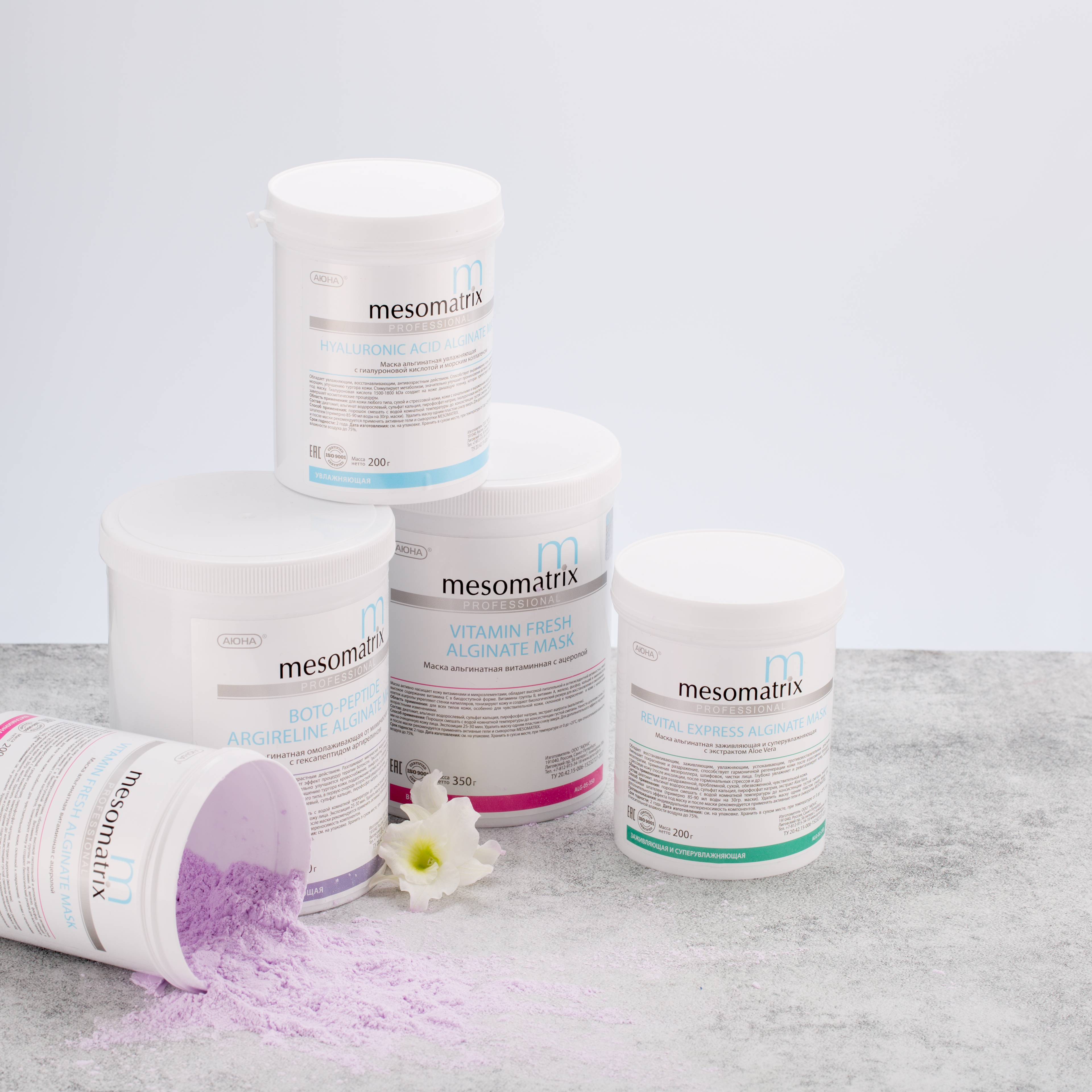 Профессиональные альгинатные маски MESOMATRIX Professional с водорослевым альгинатом натрия, диатомовой землей (диатомитом) и активными веществами натурального и биосинтетического происхождения позволяют решать основные косметические задачи: сухость, нарушение водного баланса кожи, увядание кожи и другие признаки старения, коррекция овала лица, воспаление и шелушение на коже, очищение и сужение пор.