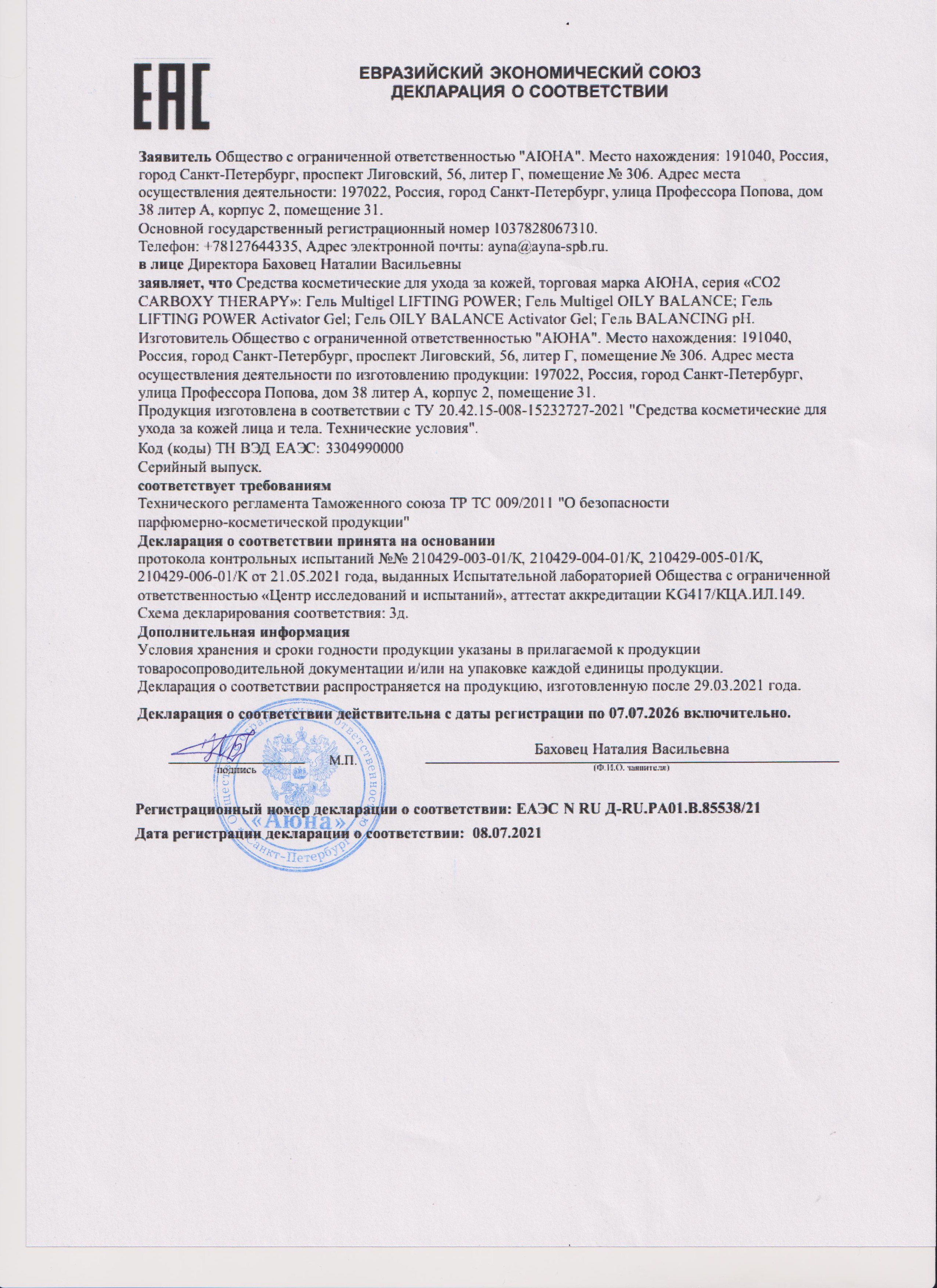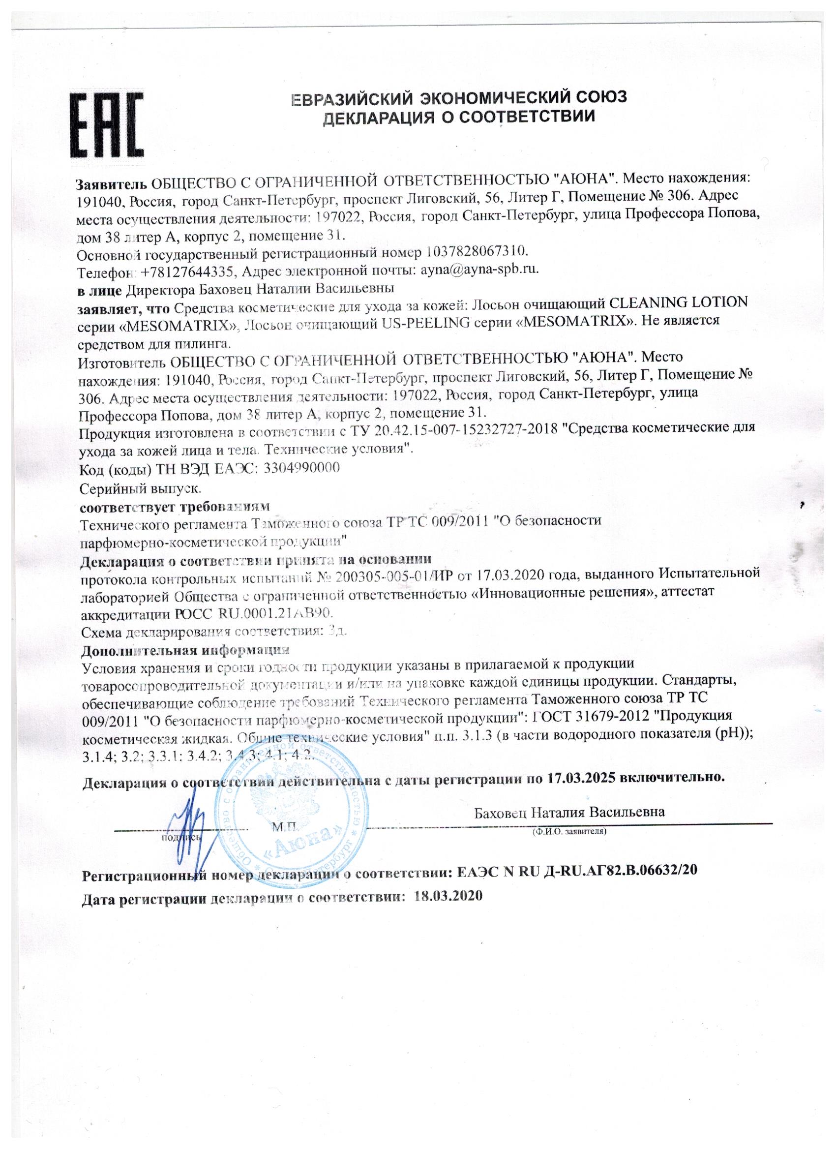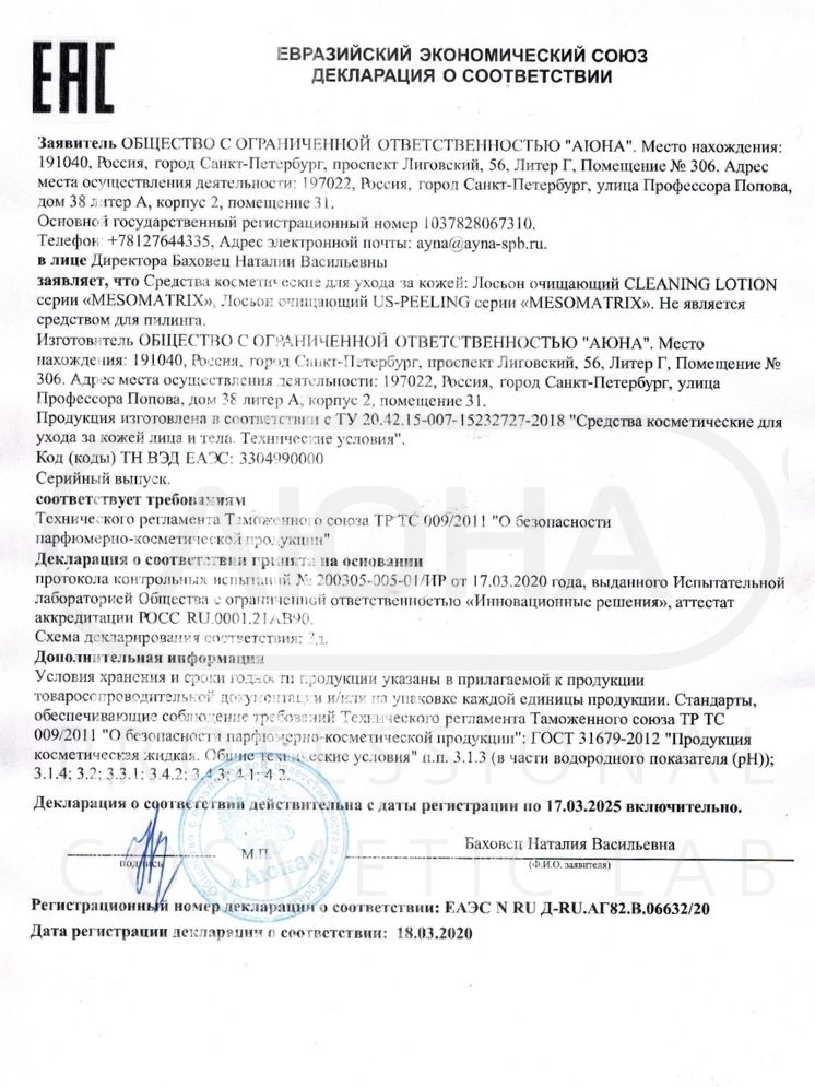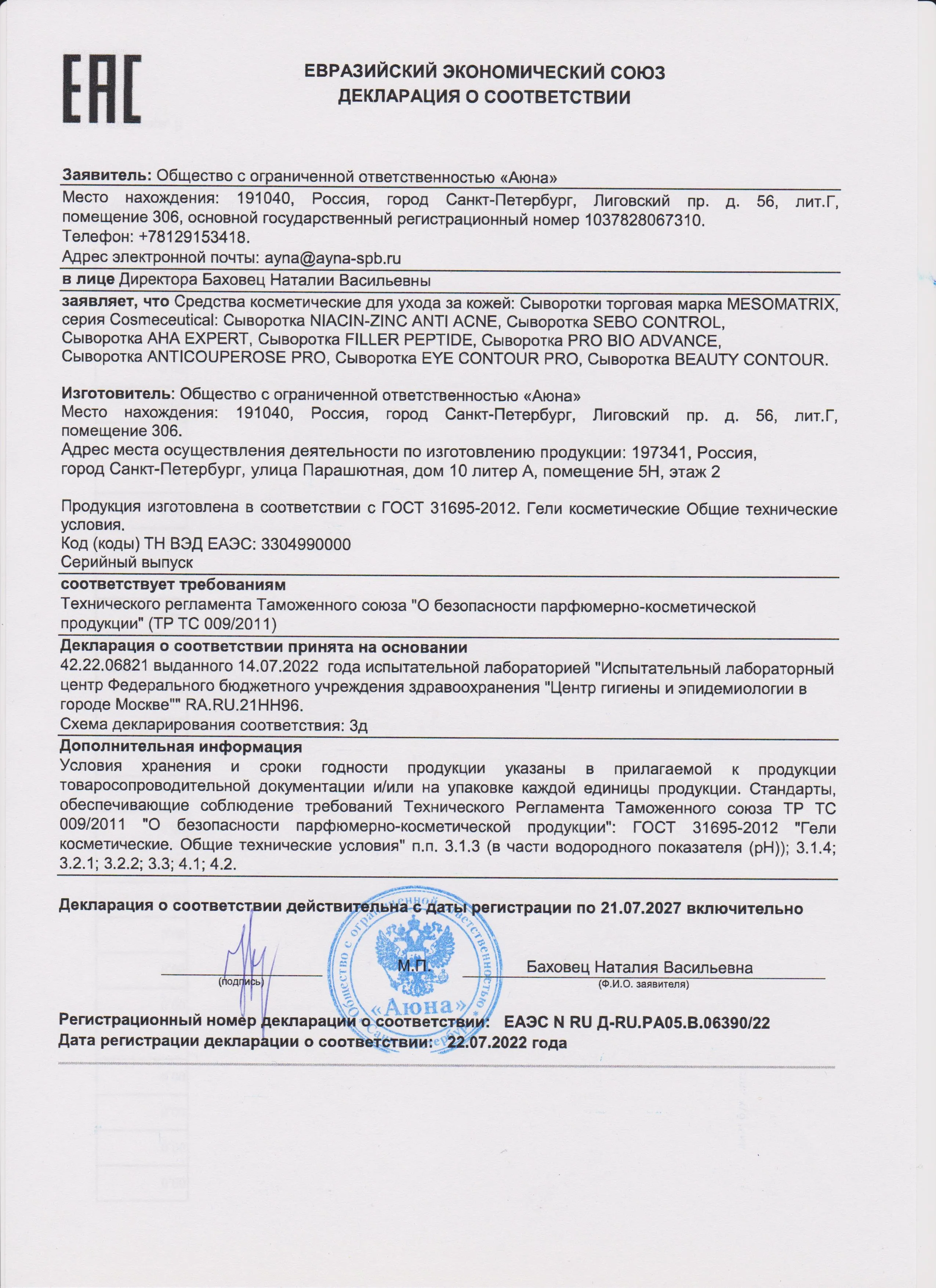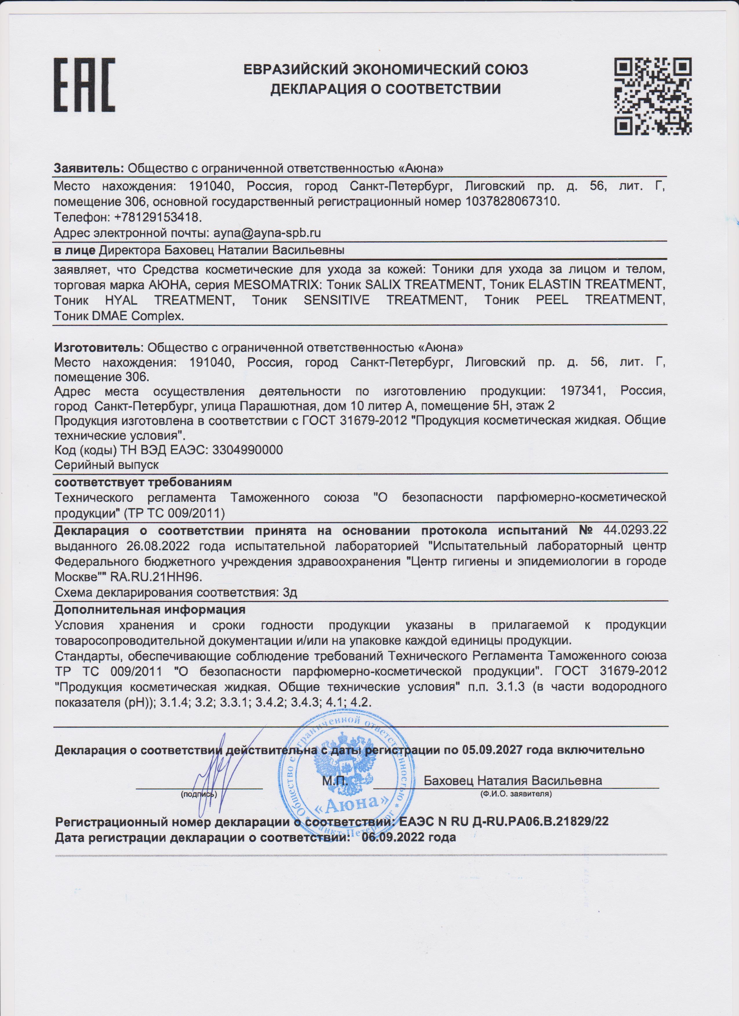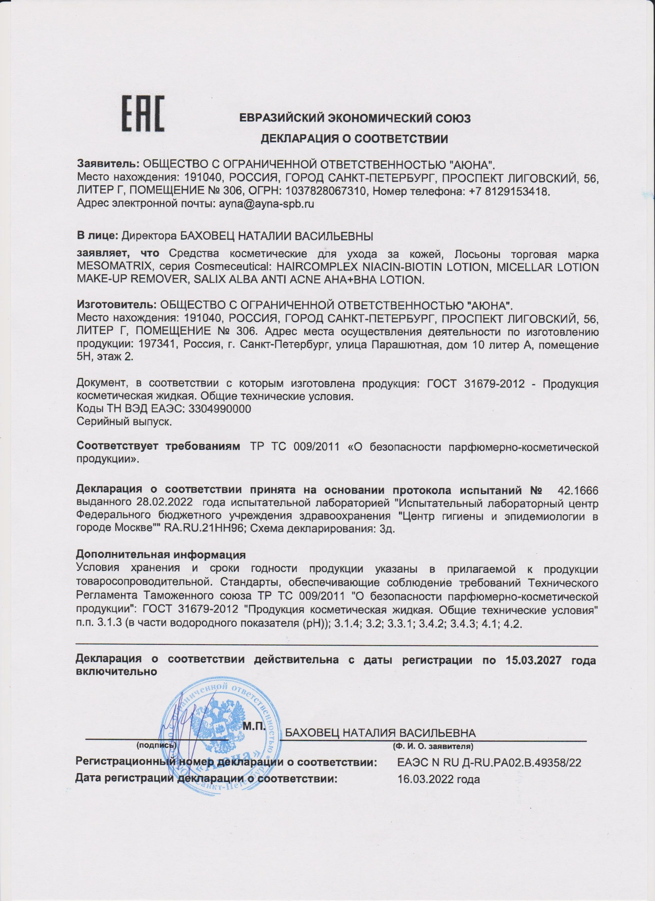 Сертификаты и декларации соответствия на продукцию компании АЮНА