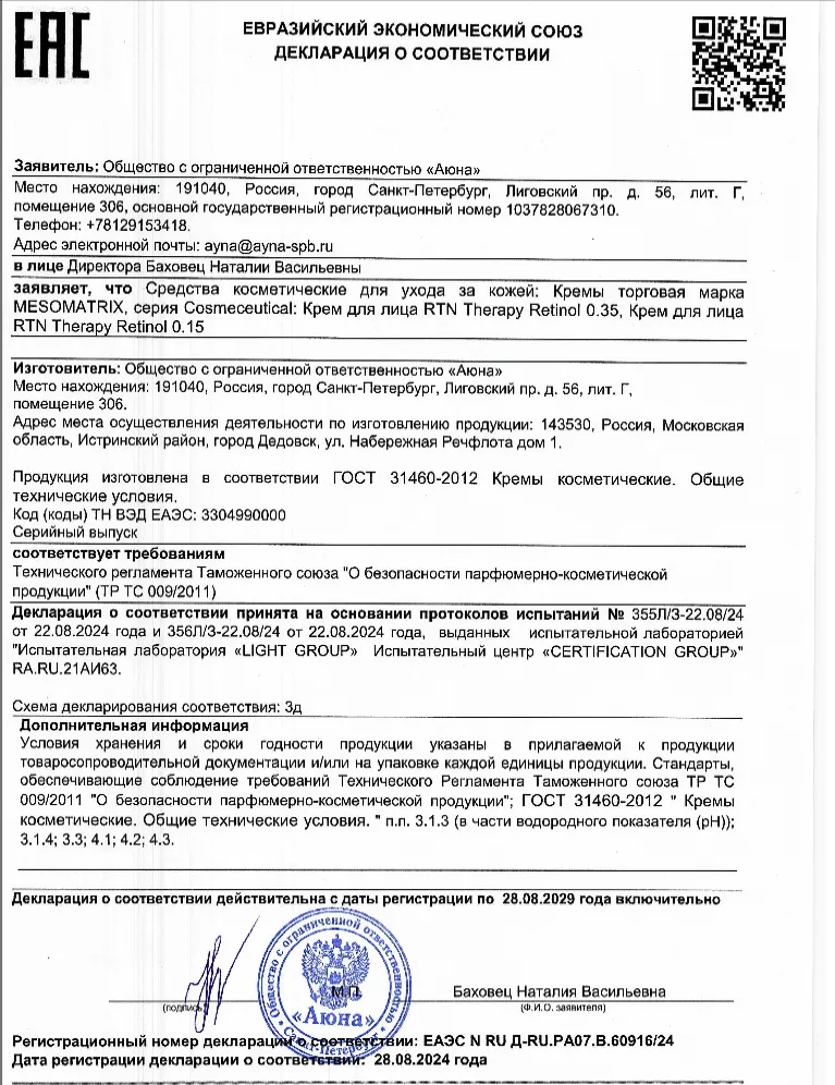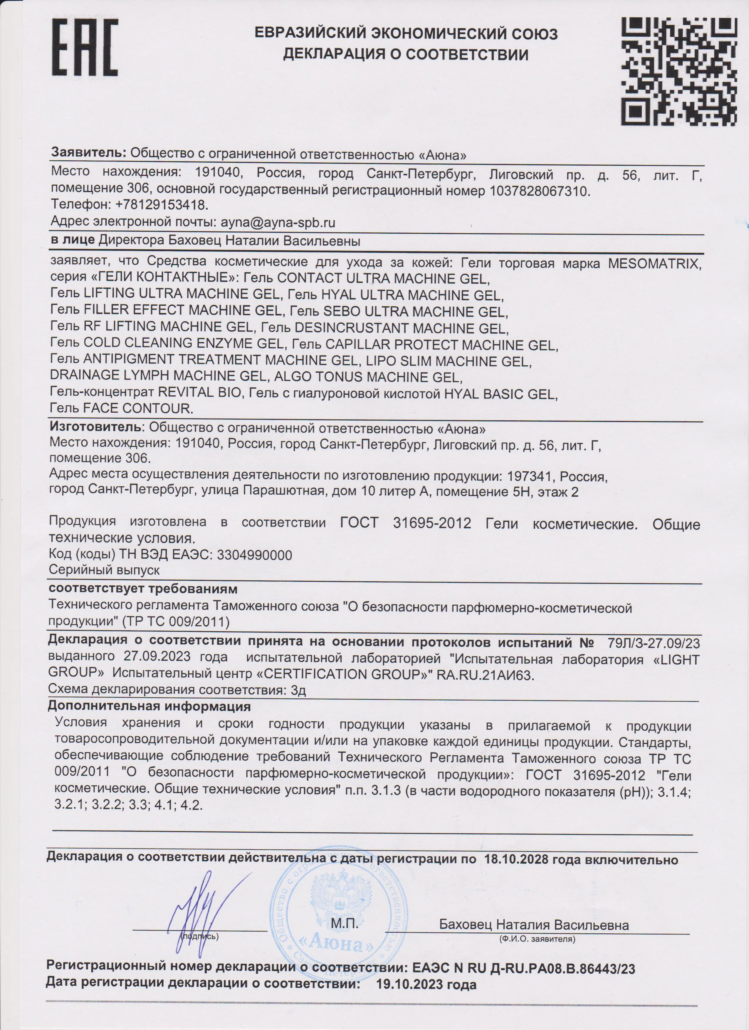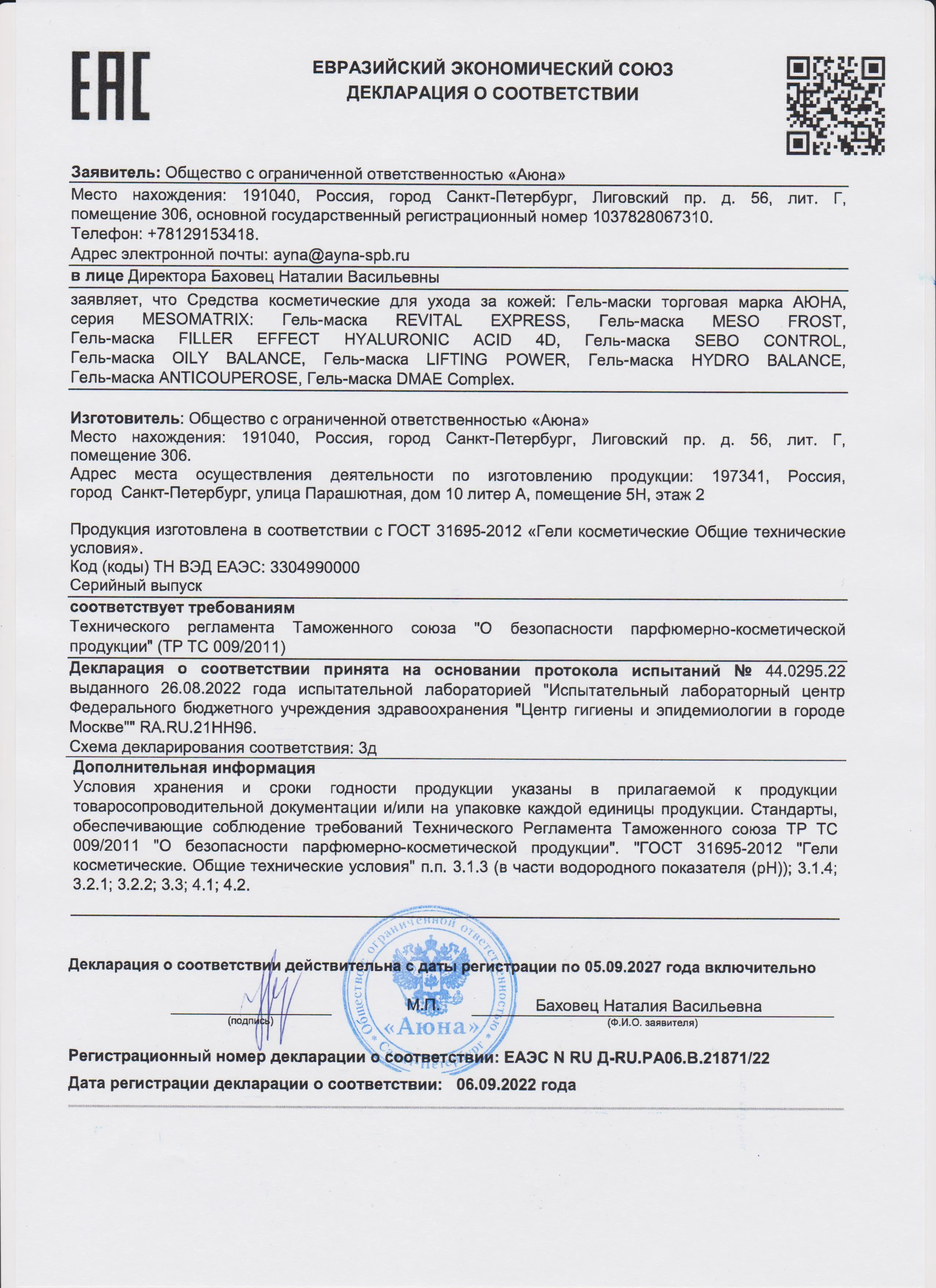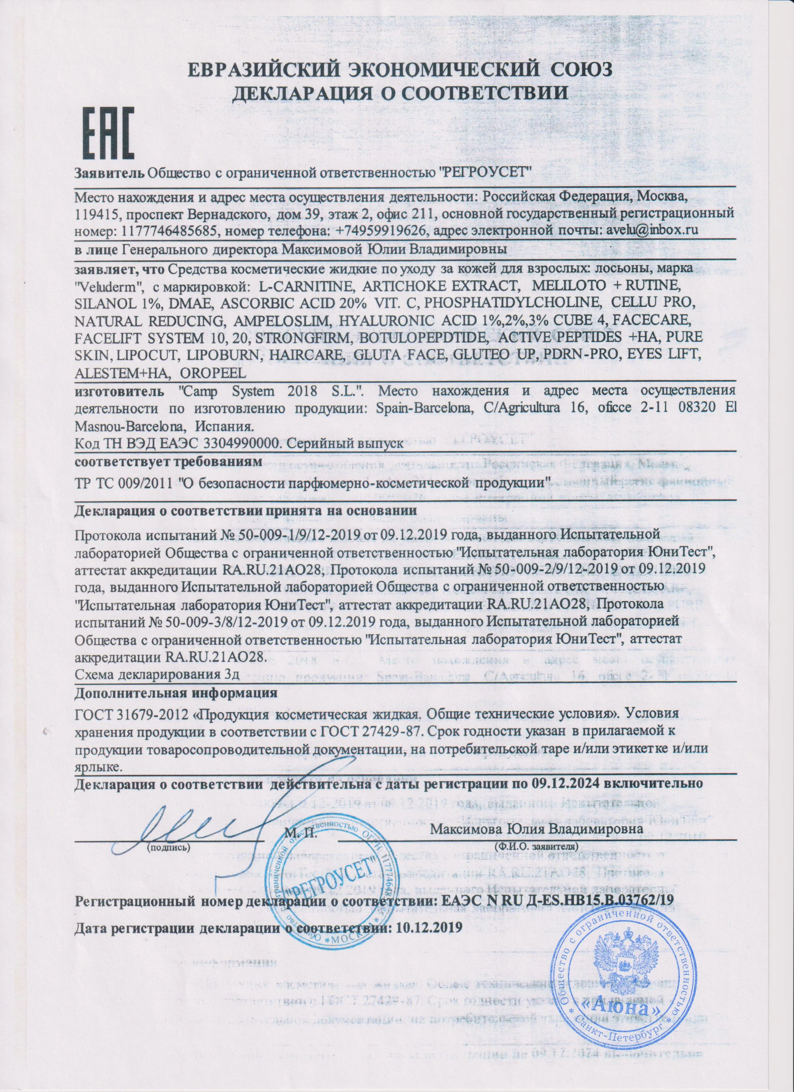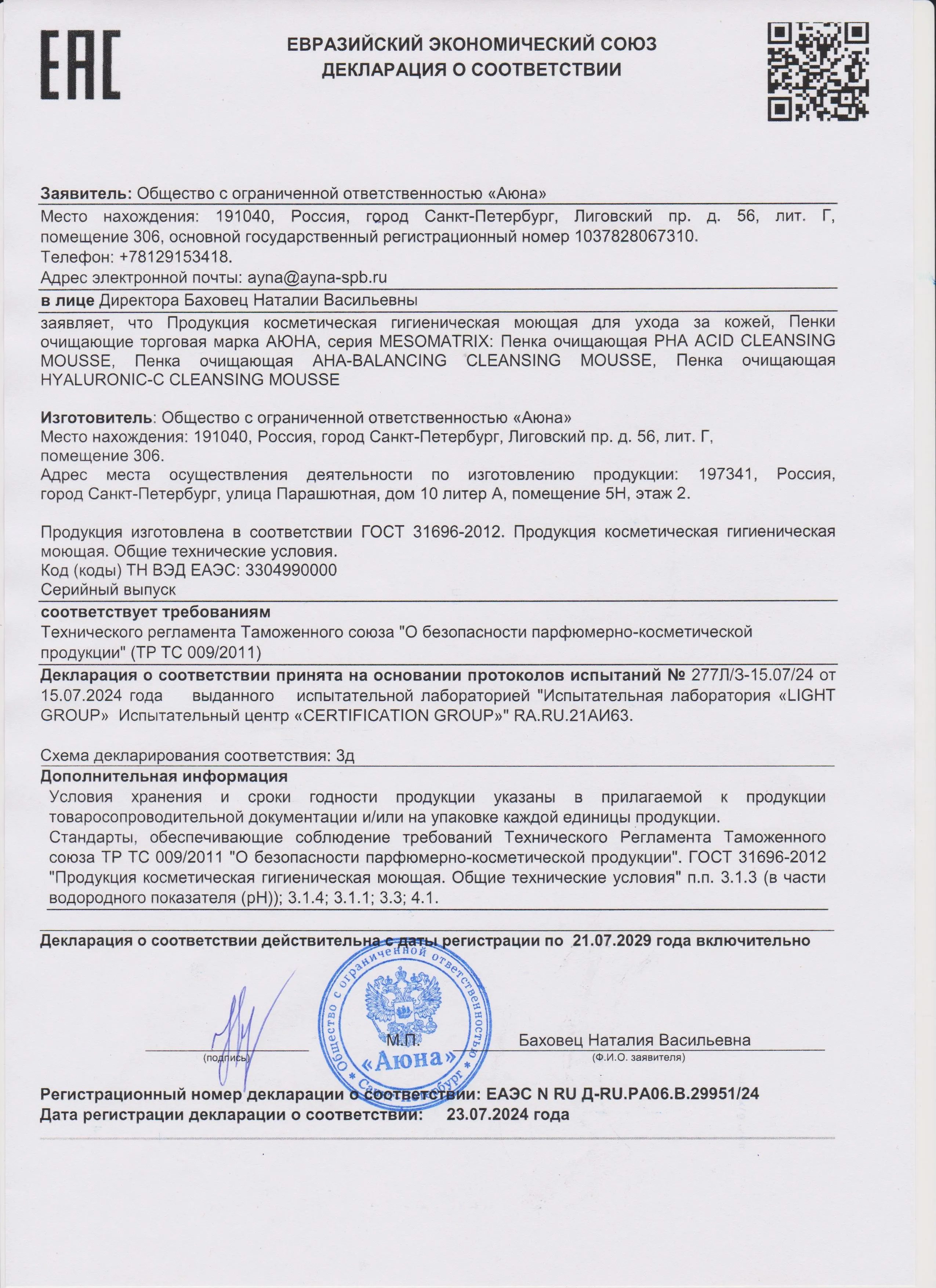 Сертификаты и декларации соответствия на продукцию компании АЮНА