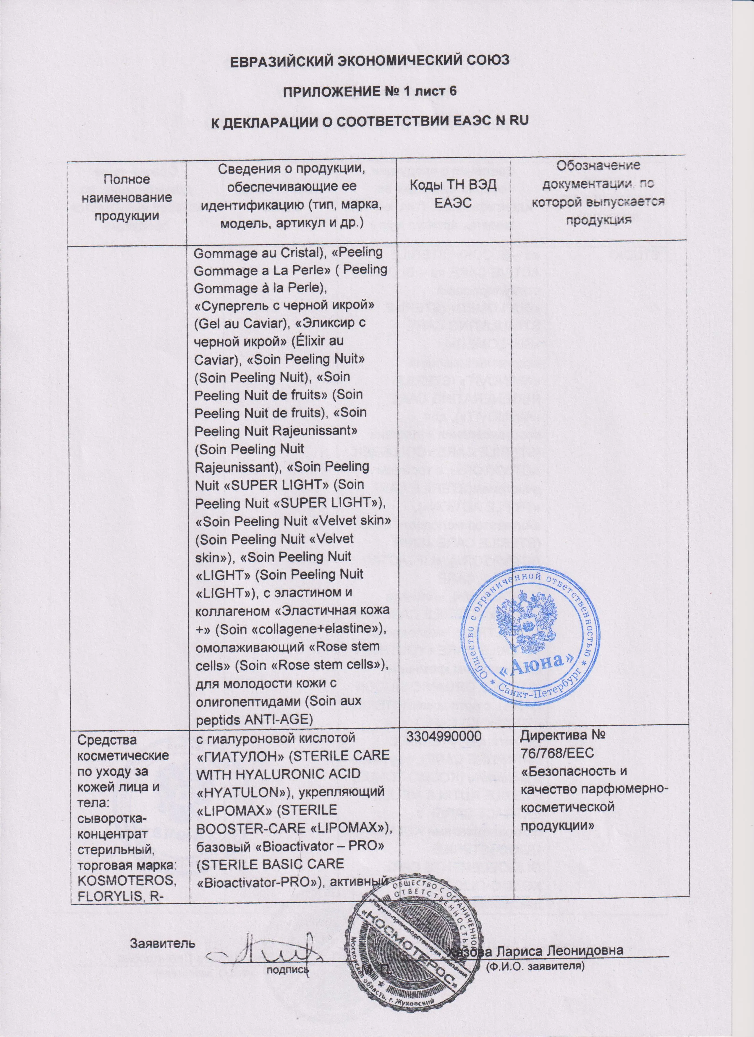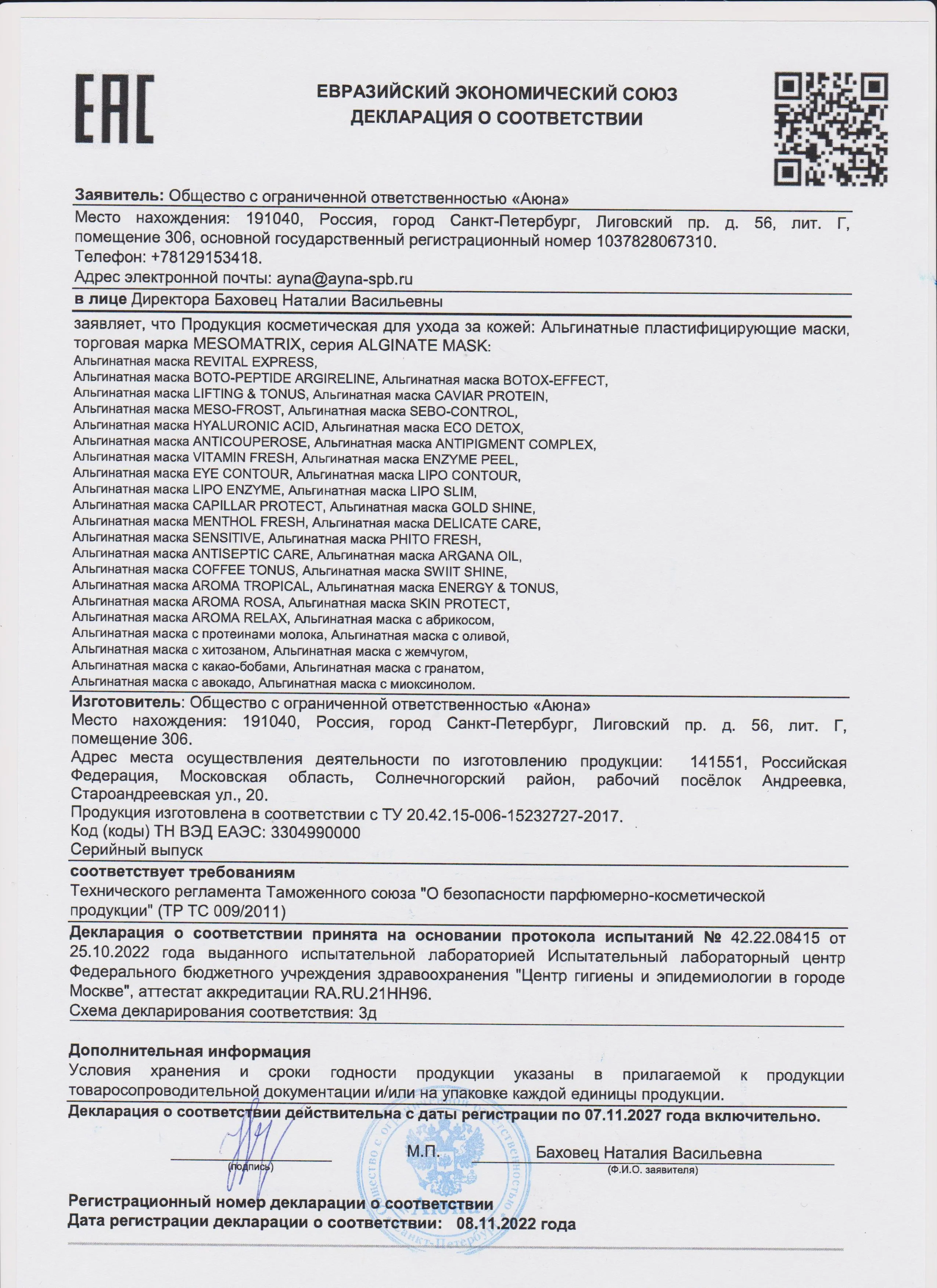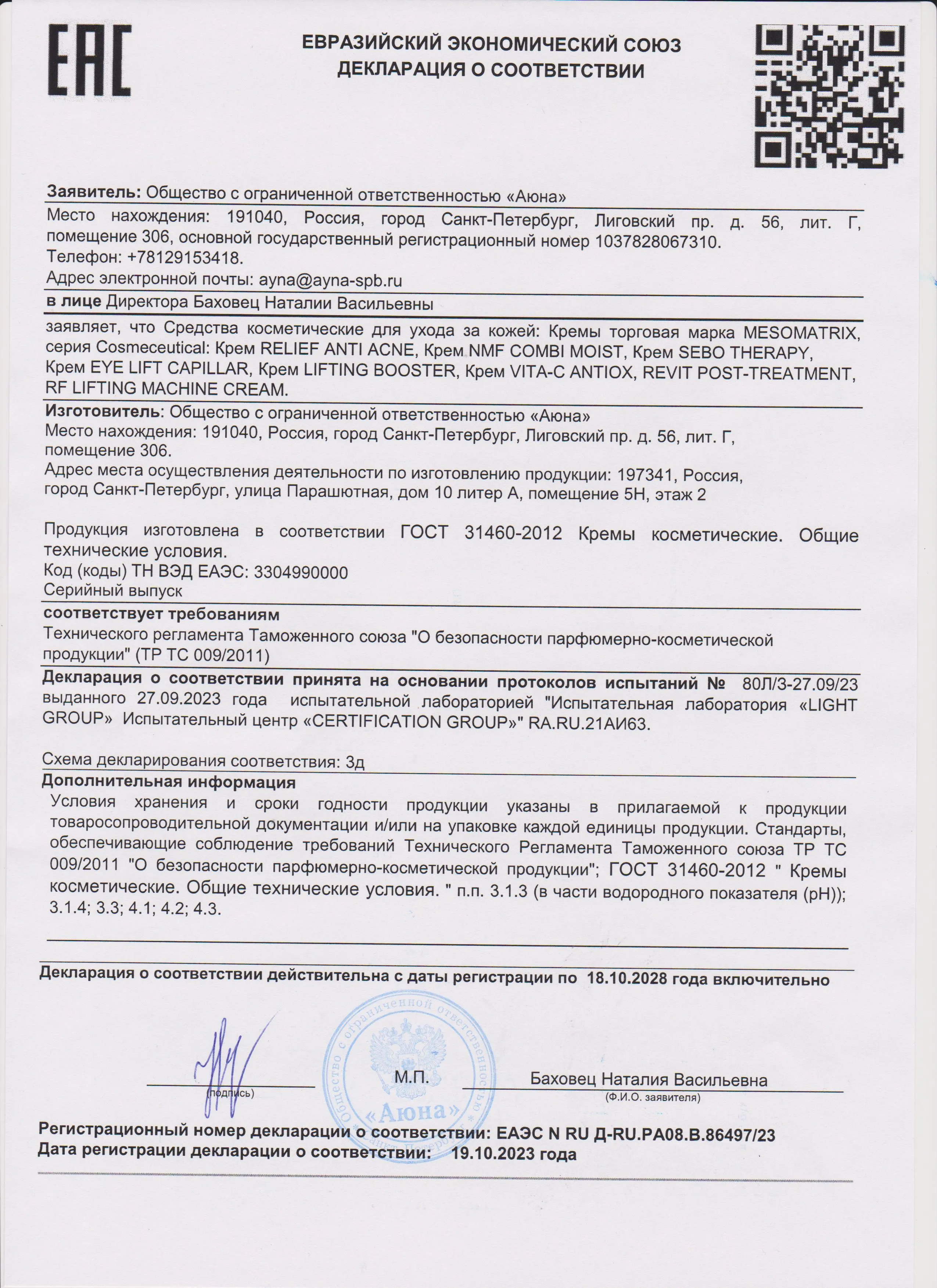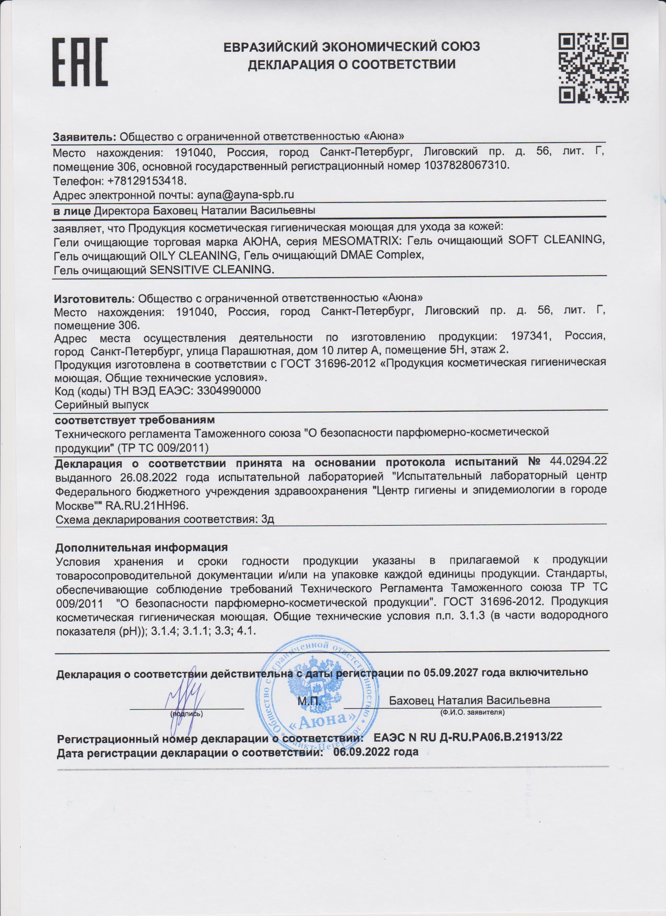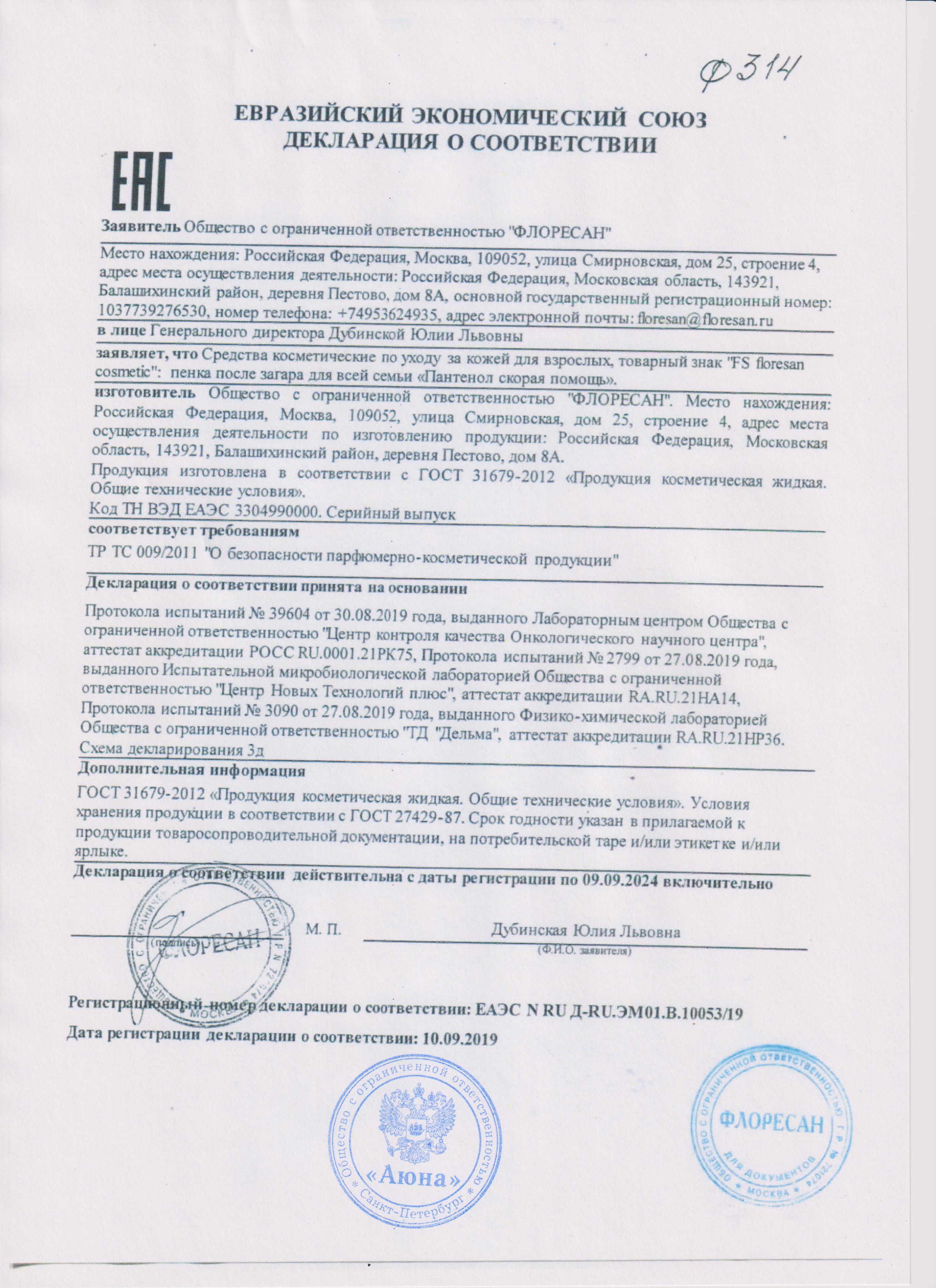 Сертификаты и декларации соответствия на продукцию компании АЮНА