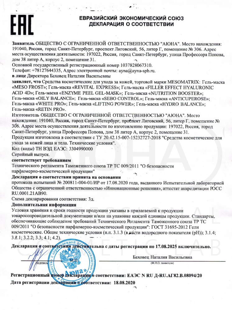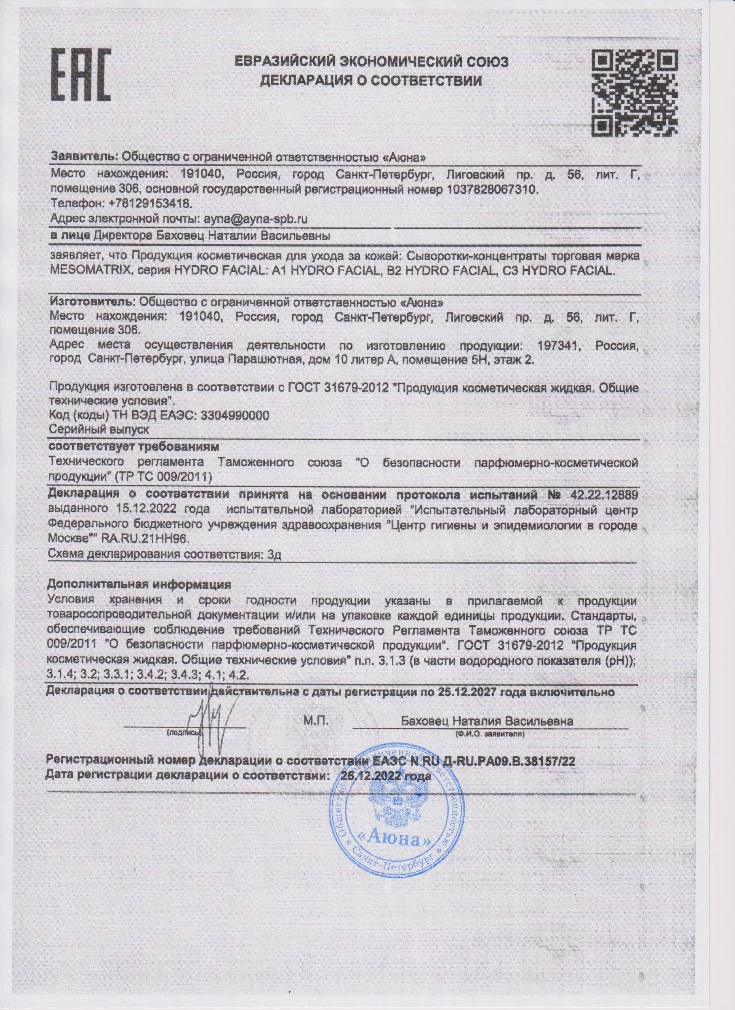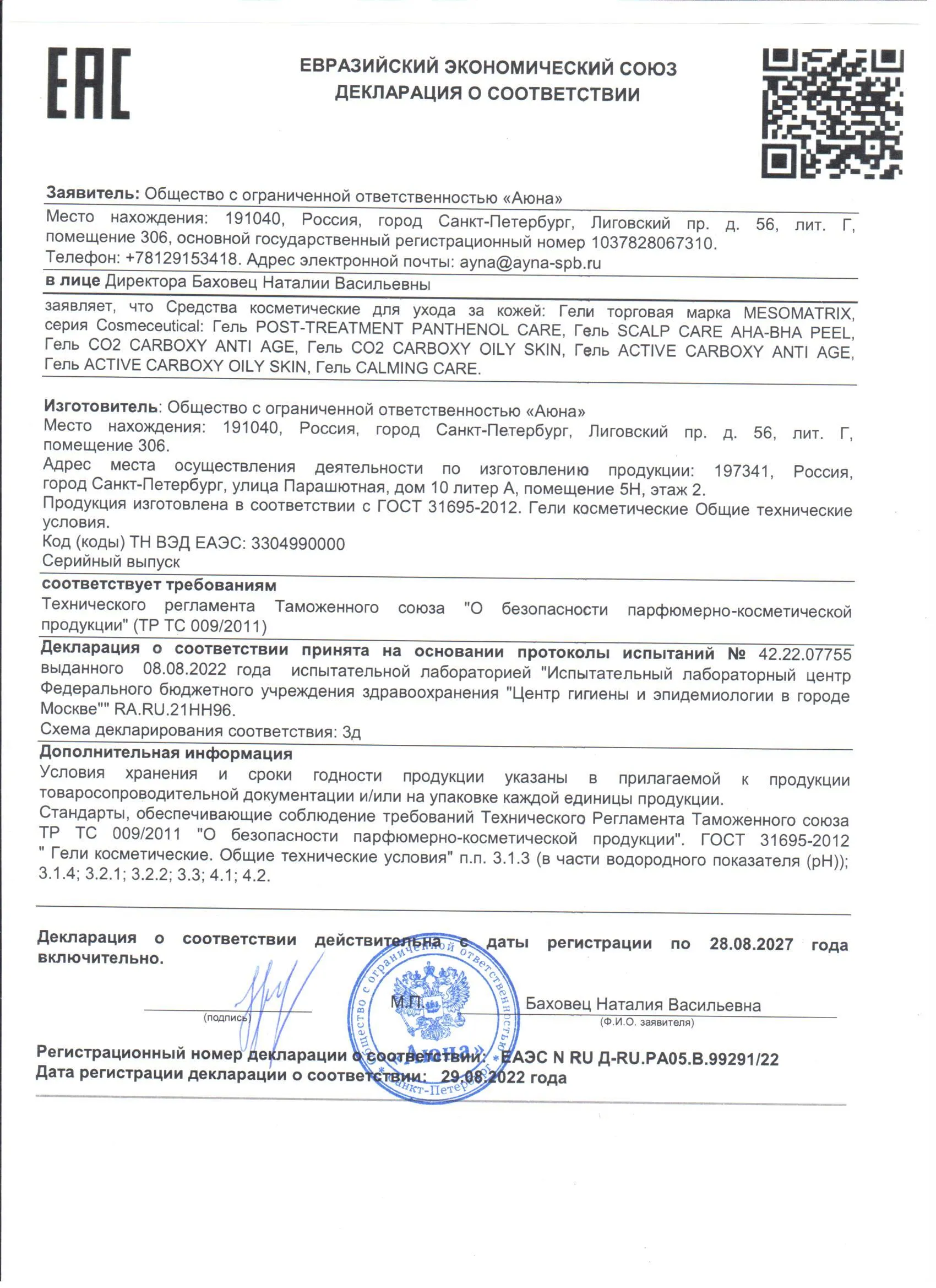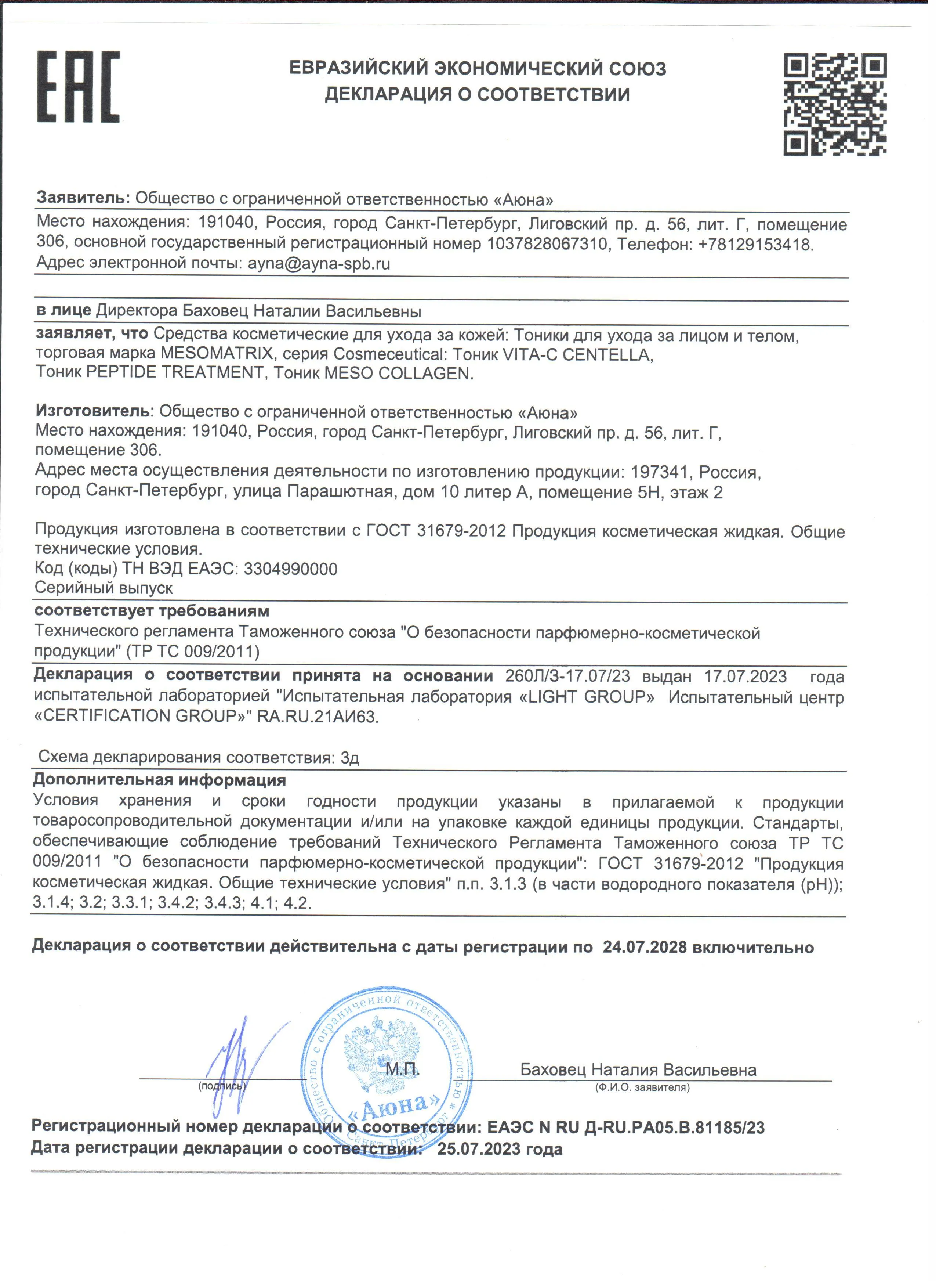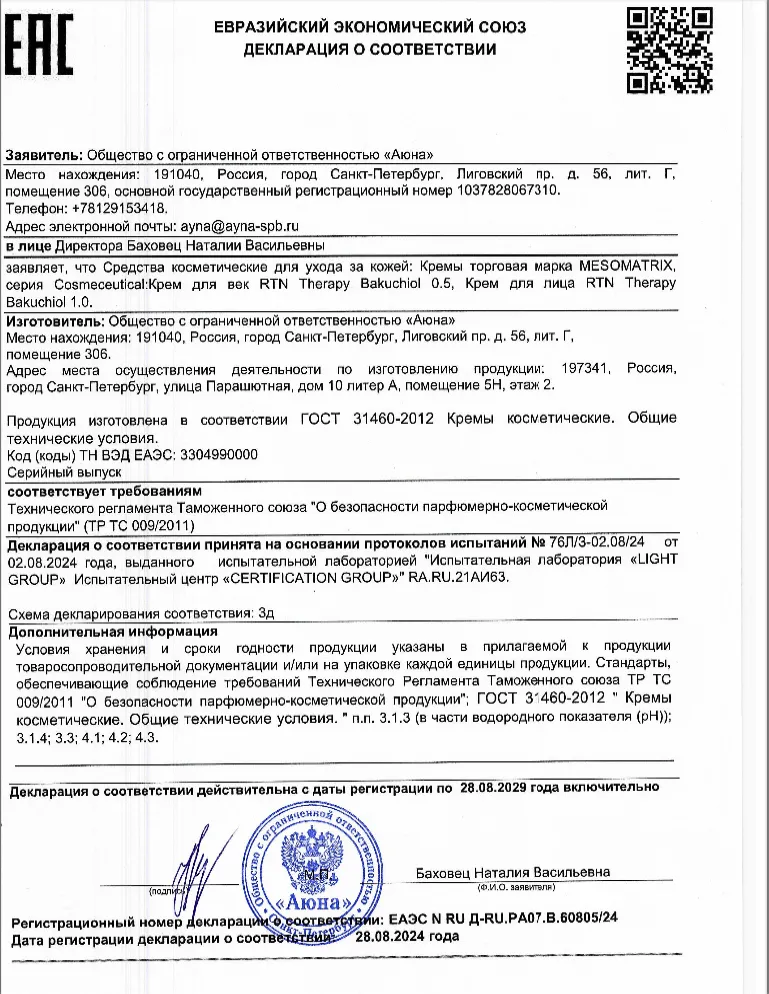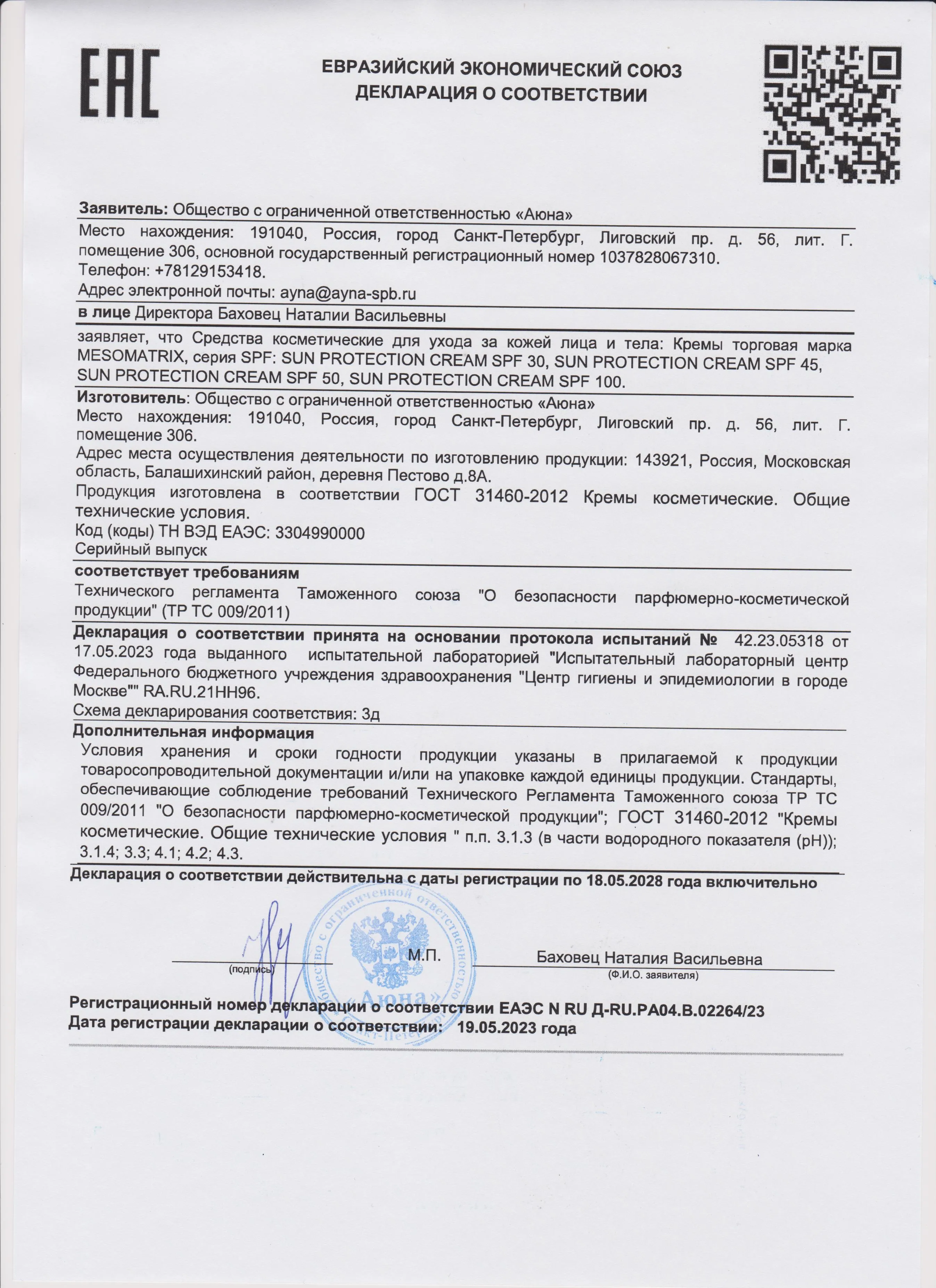Сертификаты и декларации соответствия на продукцию компании АЮНА