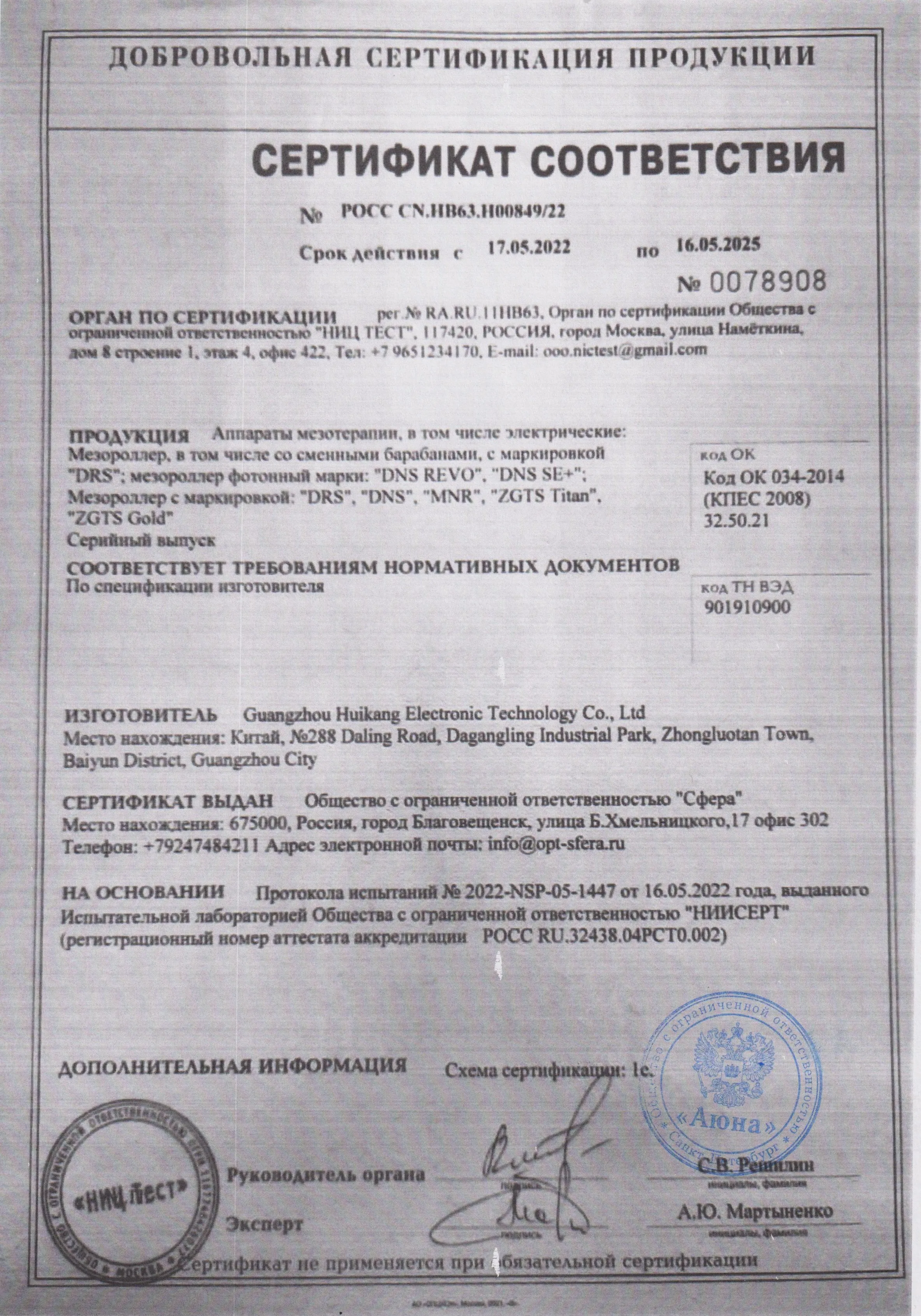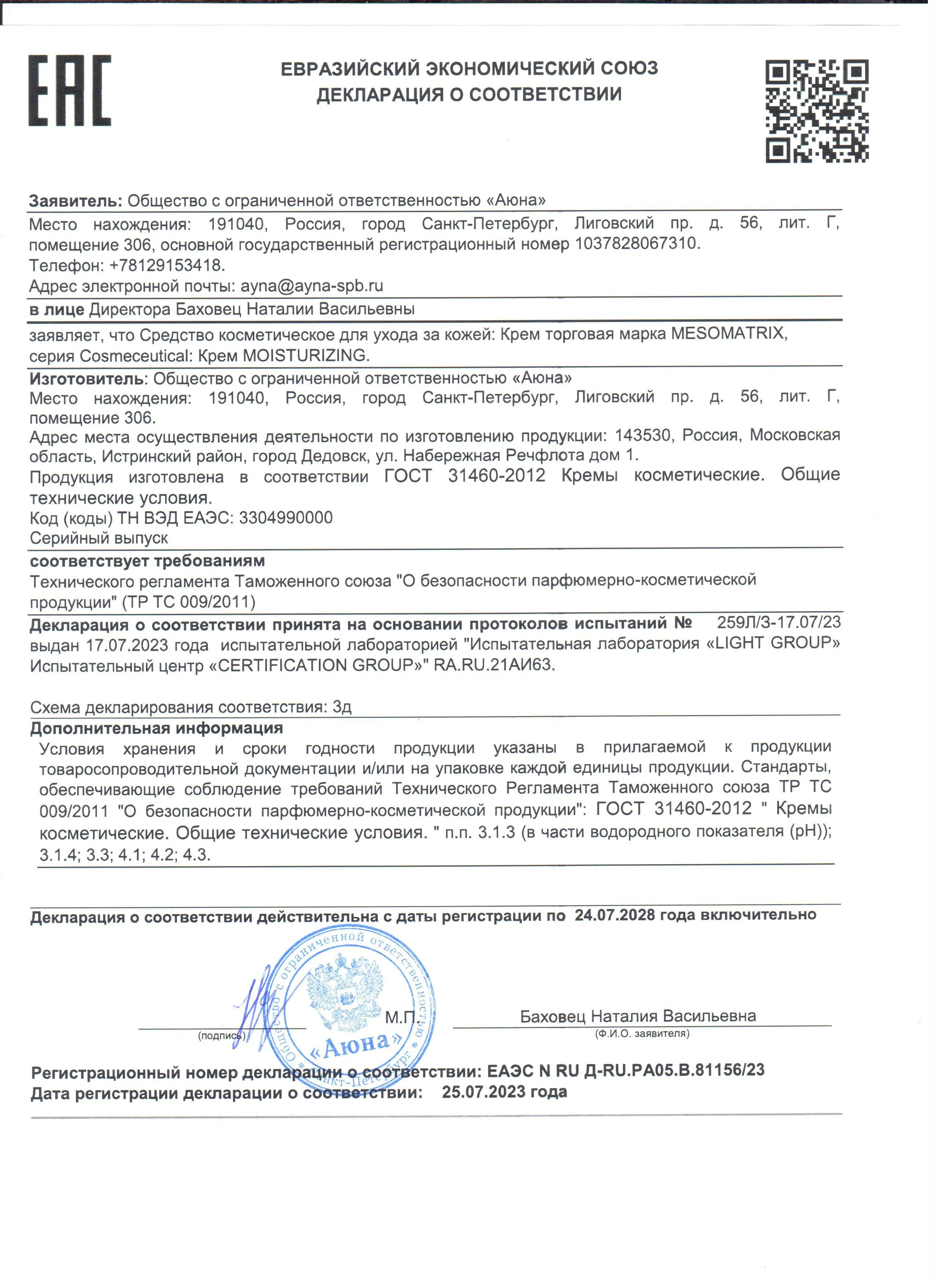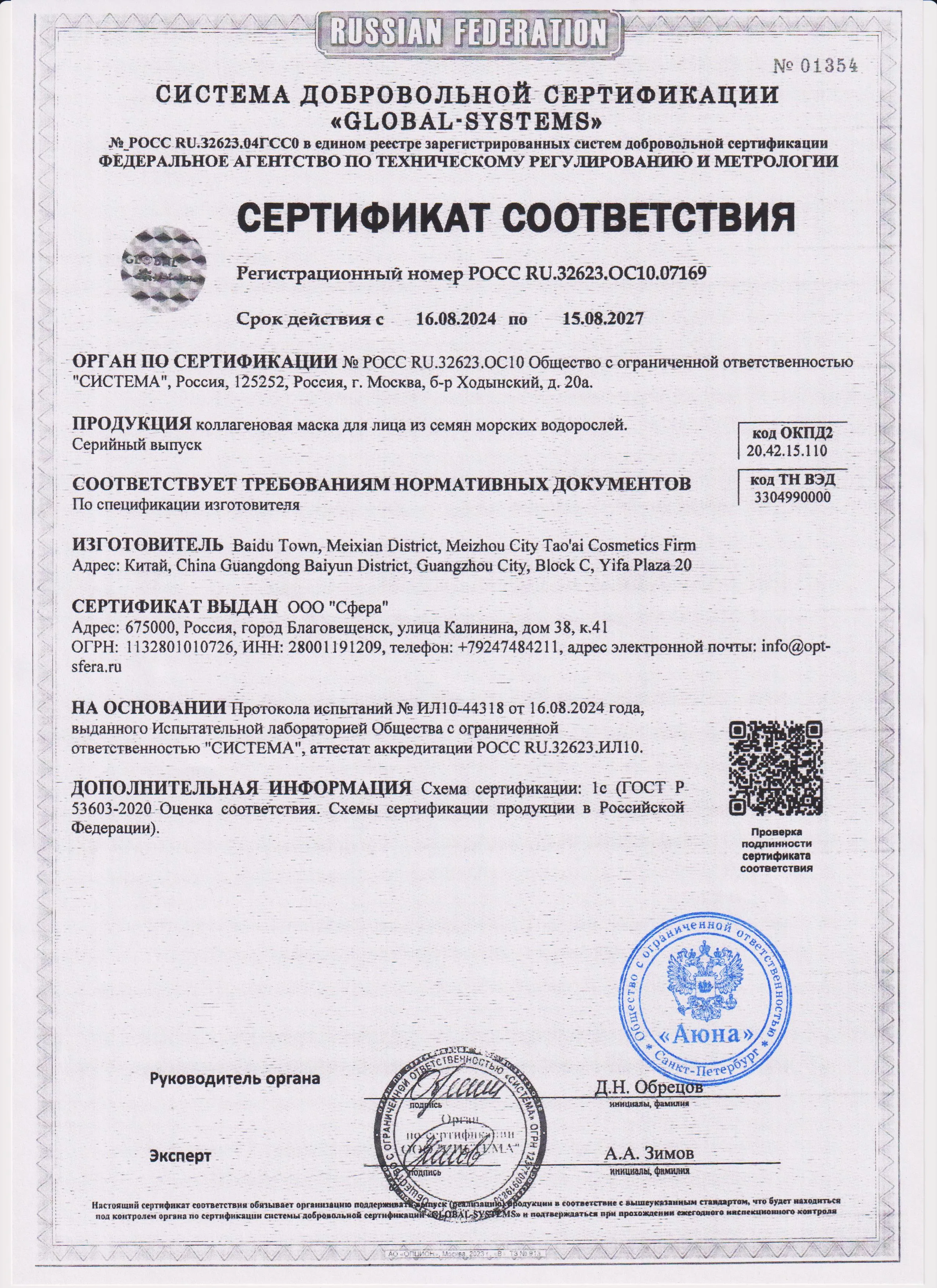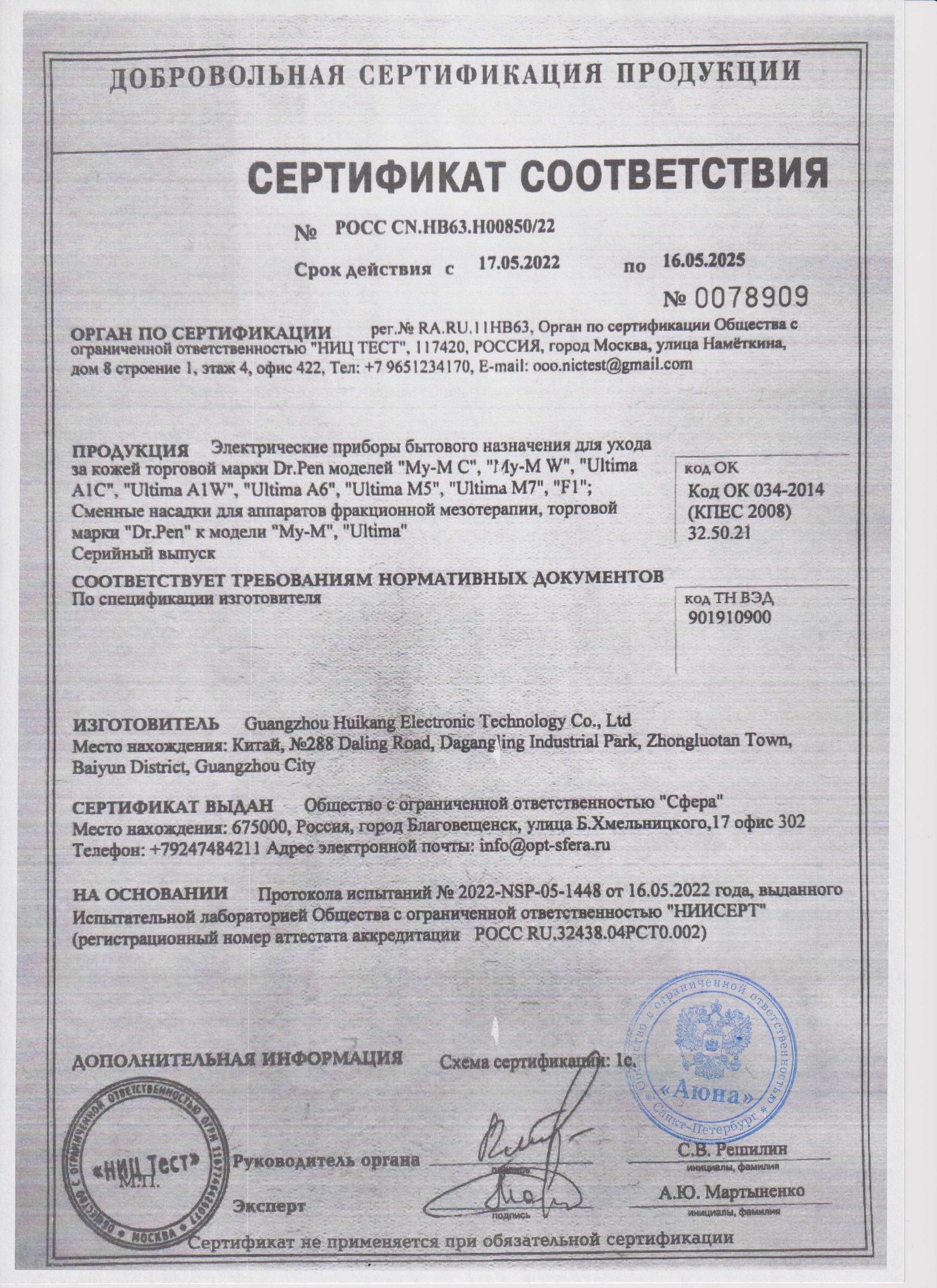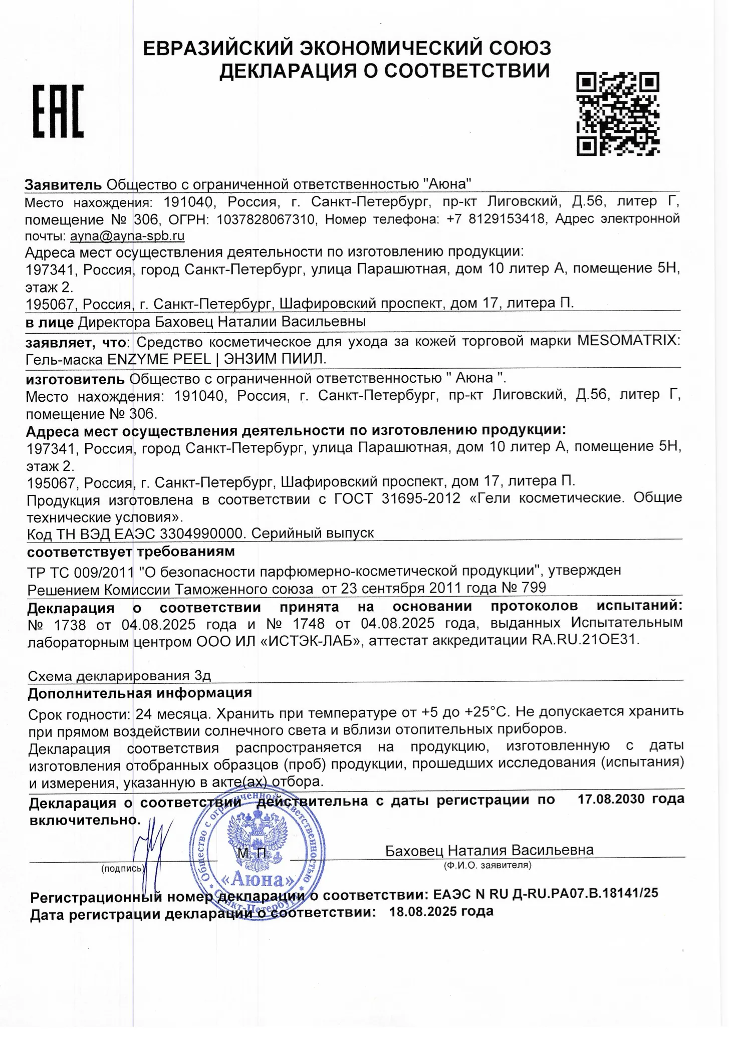 Сертификаты и декларации соответствия на продукцию компании АЮНА