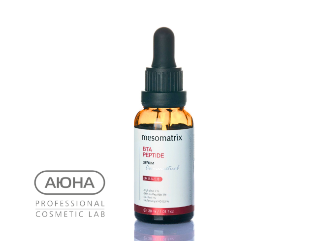 Сыворотка BTA PEPTIDE содержит в своем составе мощные компоненты: аргирелин (пептид-миорелаксант) и медный пептид GHK-Cu. Она направлена на расслабление мимических мышц и уменьшение выраженности морщин, особенно в области глаз, лба и губ.