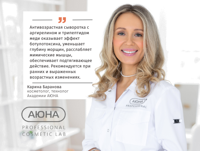Пептидная сыворотка для лица и век с миорелаксантом аргирелином 7%. Особенность сыворотки - эффект ботулотоксина, способность расслаблять мимические мышцы. Это позволяет уменьшить глубину мимических морщин, восстановить трофику тканей, разгладить заломы, сформировать новые мимические привычки. Пептидный комплекс из аргирелина (гексапептид-8) и трипептида меди обладает мощным омолаживающим и выравнивающим действием. Комплекс гиалуроновых кислот (комплекс Tetrahyal 4D) длительно увлажняет и защищает кожу от потери влаги.