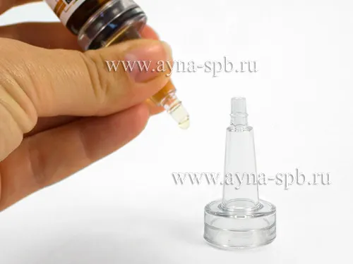 Приспособление для нанесения раствора тонирующей сыворотки во время процедуры. Капельница имеет защитную крышечку для хранения раствора.