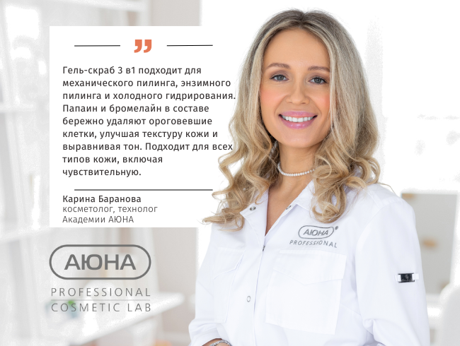 Очищающий комплекс тройного действия: энзимный и механический пилинг кожи, а также холодное гидрирование.