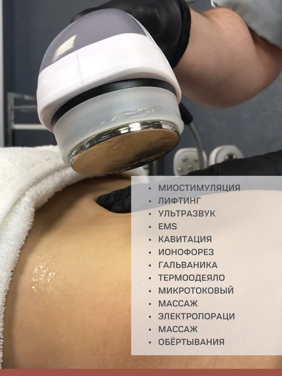 | Процедура : | Миостимуляция /EMS, LED, УЗТ, Фонофорез, Электропорация, Обертывания, Микротоковая терапия, Ионофорез / гальванизация, Кавитация |