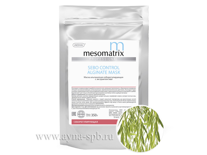 Альгинатная маска для жирной кожи регулирует и гармонизирует выработку кожного сала (себорегуляция), уменьшает воспаления и образование комедонов, обладает восстанавливающим, успокаивающим, противовоспалительным действием. Тонизирует поры, насыщает проблемную кожу экстрактом коры ивы, содержащим таниноподбные вещества, тормозящие активность бактерий и грибов. Альгинат в комплексе с экстрактом ивы выравнивает цвет лица и способствует рассасыванию застойных пятен и рубцов постакне.
